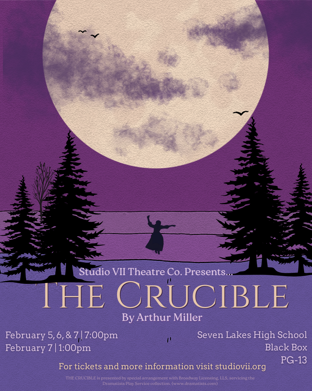 We are officially sold out for all showings of The Crucible. For any questions or releases of your tickets, please contact boxoffice@studiovii.org